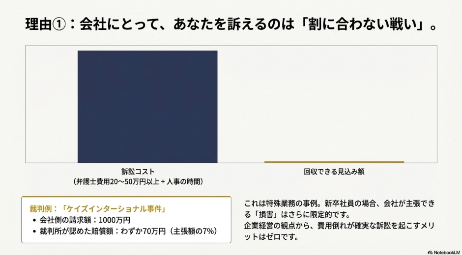会社があなたを訴えることが現実的でない理由は、感情論ではなく、極めて合理的なものです。