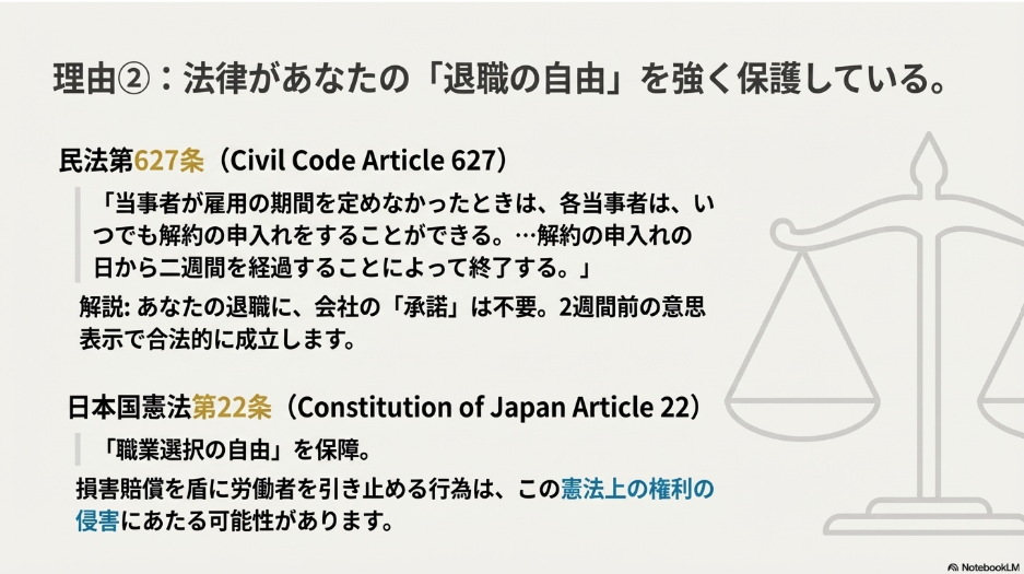 理由②:労働者の「退職の自由」は法律で強く保護されている