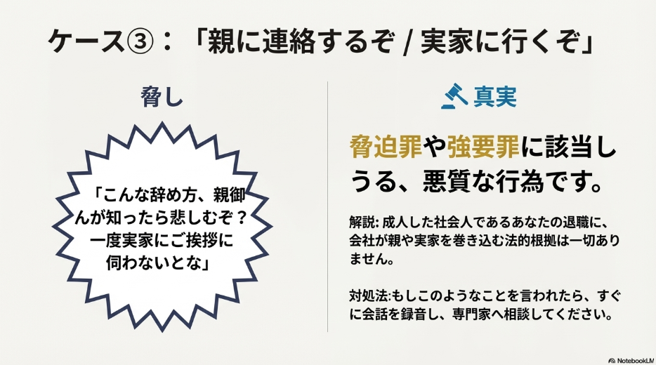 ケース③:「親に連絡するぞ」「実家に行くぞ」→ 脅迫罪や強要罪の可能性