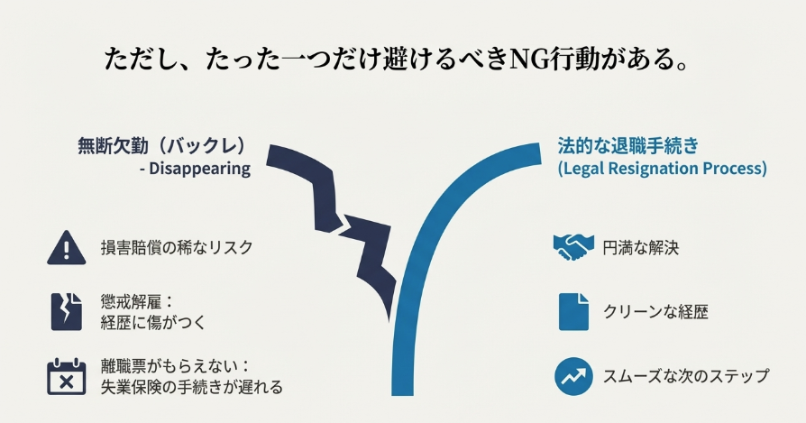 その気持ちはわかりますが、無断欠勤(バックレ)だけは絶対に避けるべきです。バックレは、