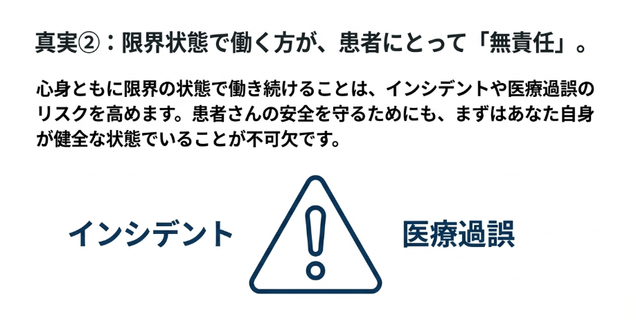 ミスが許されない医療現場だからこそ、心身ともに限界の状態で働き続けることの方が、インシデントや医療過誤のリスクを高める「無責任」な行為と言えます。