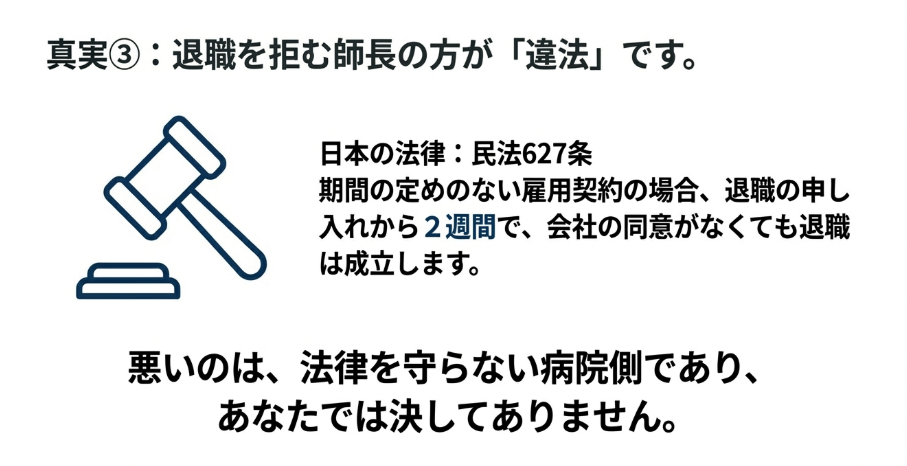 つまり、師長が「辞めさせない」と退職届を突き返したり、数ヶ月も先の退職日を指定したりする行為は、あなたの「退職の自由」を侵害する違法行為である可能性が非常に高いのです。