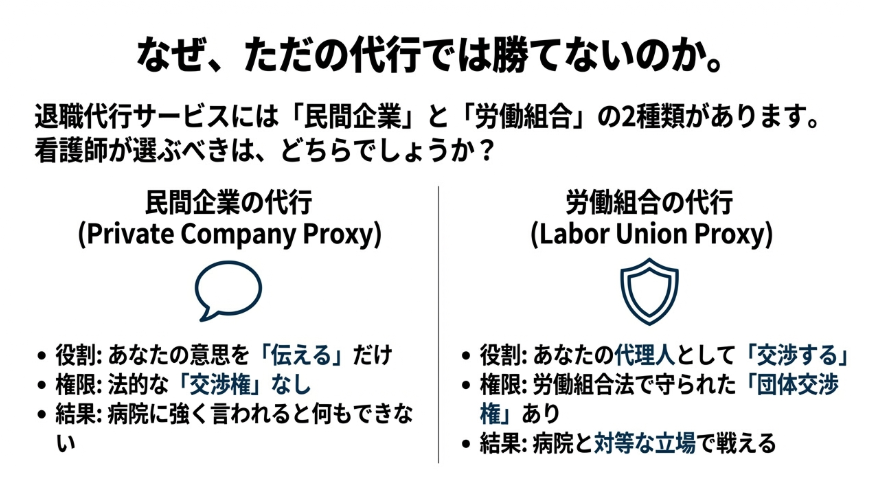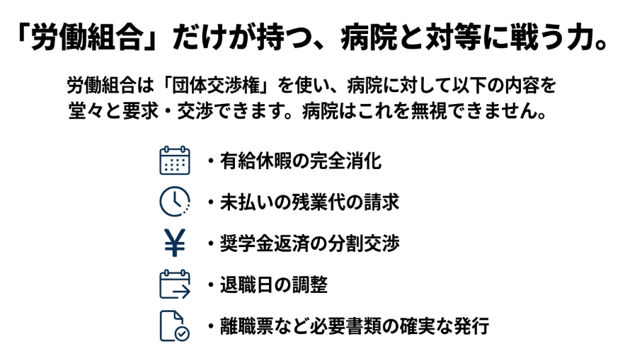 なぜなら、一般企業よりも引き止めが強く、独特の慣習が根付いている病院という組織と対峙するには、法的な「交渉権」が不可欠だからです。