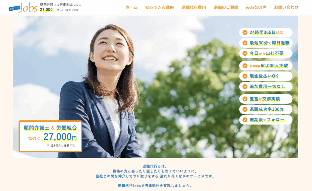 パワハラや長時間労働などで、「心身ともに限界ぎりぎり…」という方には、『退職代行 Jobs』が向いています。