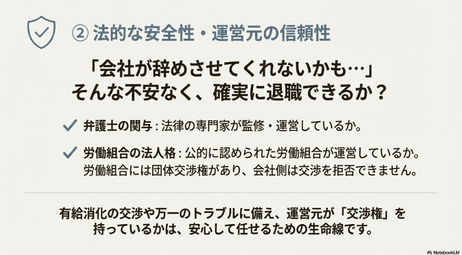 退職そのものは代行できますが、未払い残業代の請求や有給消化の交渉など、踏み込んだやり取りには法律の知識や交渉権限が必要です。