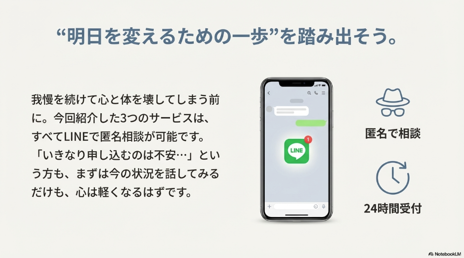 24時間受付・LINEでの相談ができるサービスだと、精神的な負担を少しでも早く軽くできます。