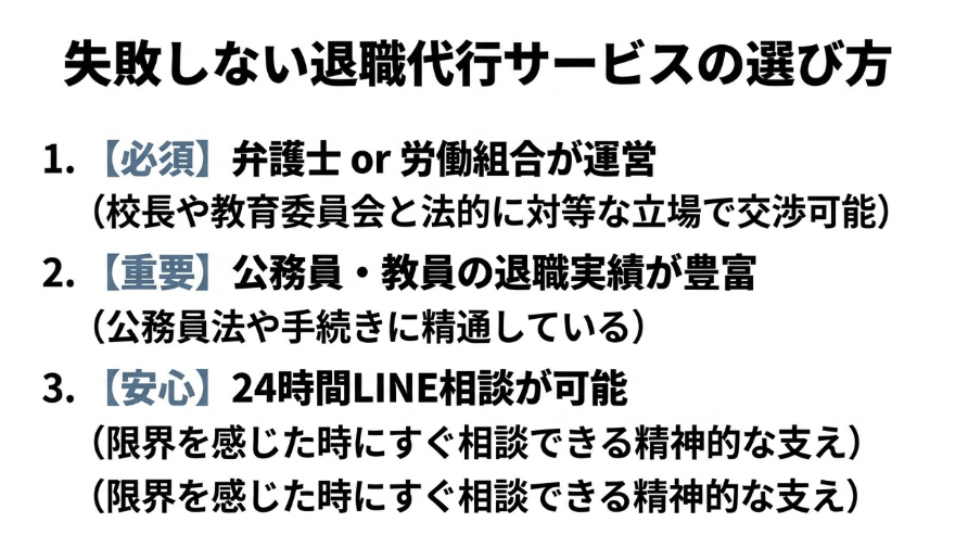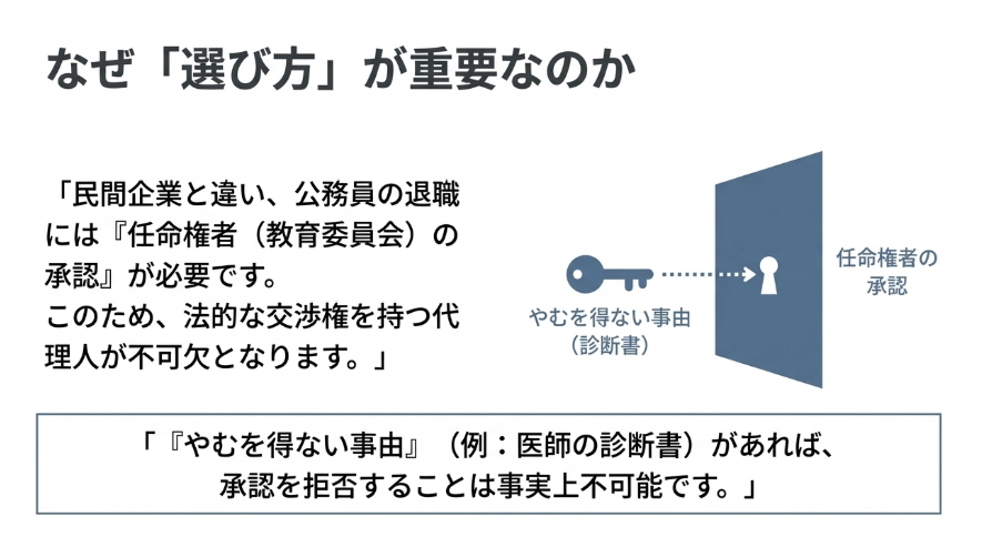 この「承認」という壁があるため、法律知識のない安価な民間業者が「退職します」と伝えても、校長や教育委員会から「公務員法では承認が必要だ」と一蹴され、失敗に終わるリスクがあるのです。