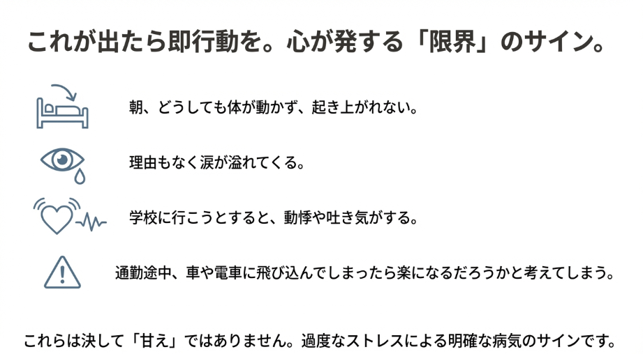 過度なストレスによって引き起こされる「うつ病」や「適応障害」という、明確な病気のサインです。