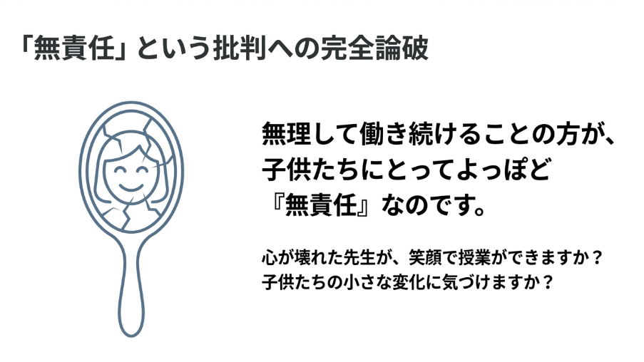 不安定な精神状態で教壇に立ち、万が一、子供たちの前で倒れてしまったり、取り返しのつかない事故を起こしてしまったりする方が、はるかに大きな迷惑をかけることになります。