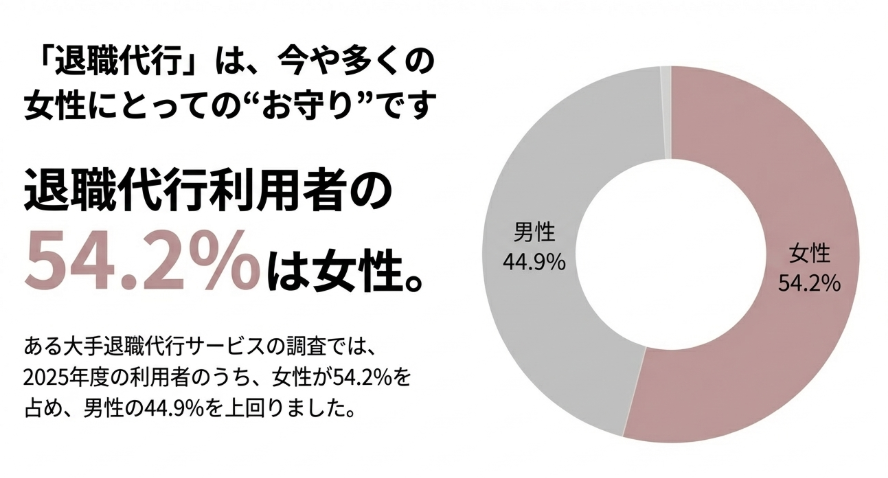 ある大手退職代行サービスの調査では、2025年度の利用者のうち、女性が54.2%を占め、男性の44.9%を上回りました。